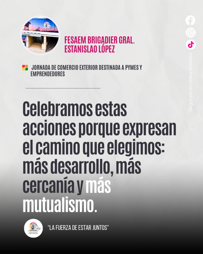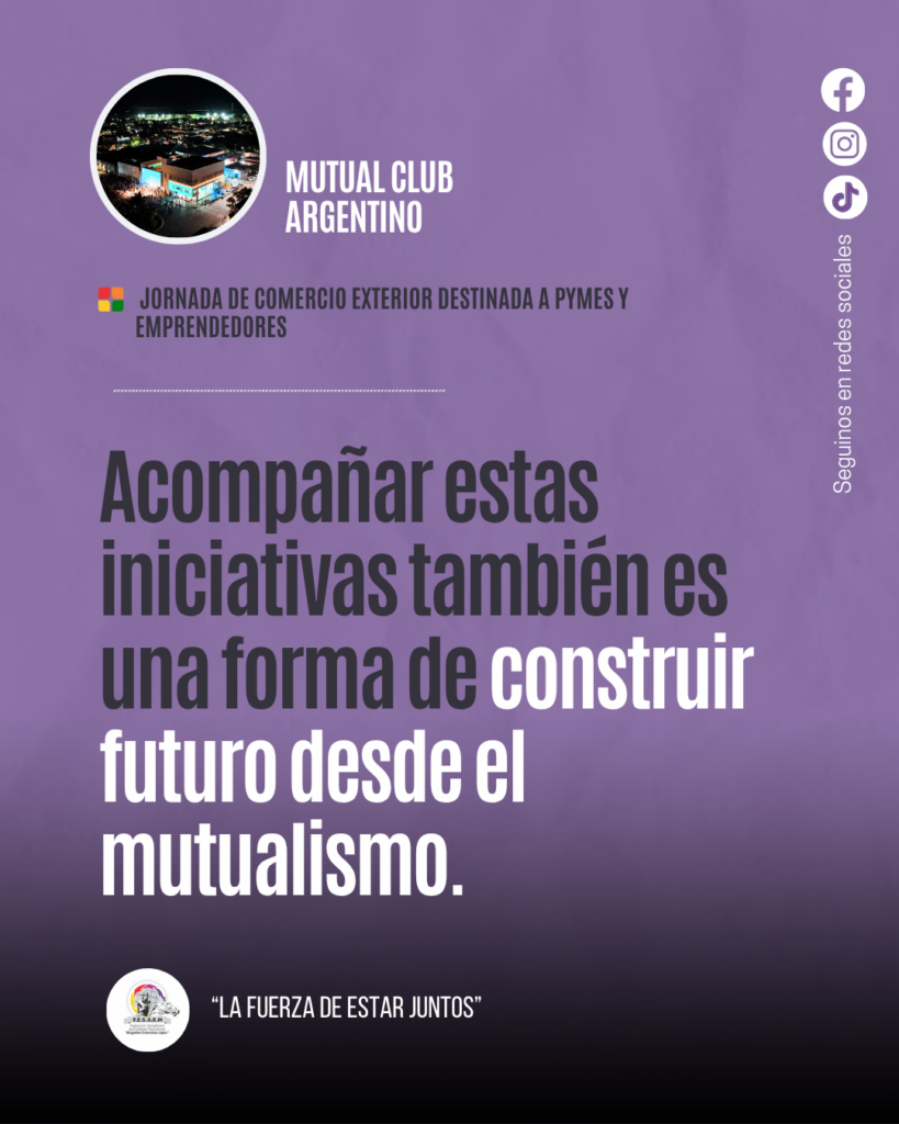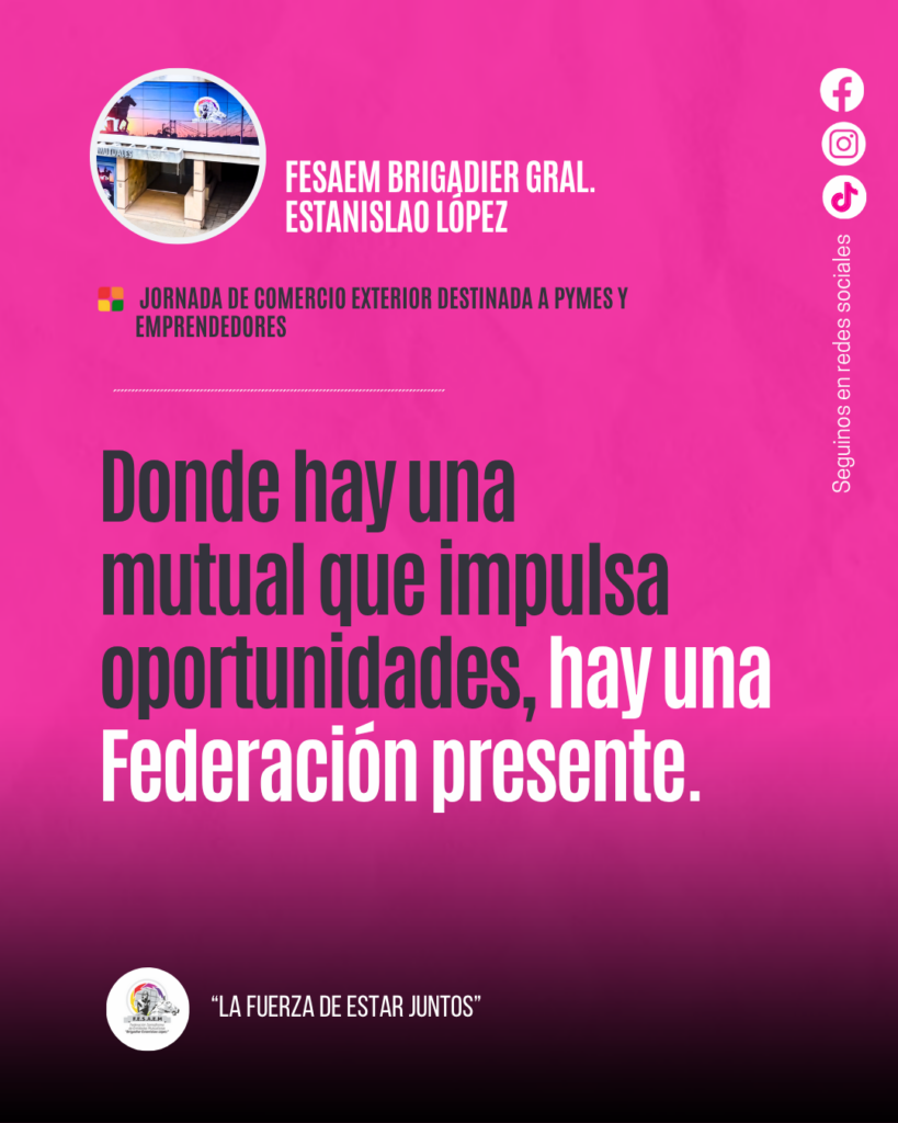 La Federación Santafesina de Entidades Mutualistas Brigadier General Estanislao López (FESAEM) felicita a la Asociación Mutual del Club Atlético Argentino por la realización de una jornada de comercio exterior destinada a pymes y emprendedores, destacando el valor de estas iniciativas que reflejan el compromiso del mutualismo con el desarrollo productivo, comercial y regional.
